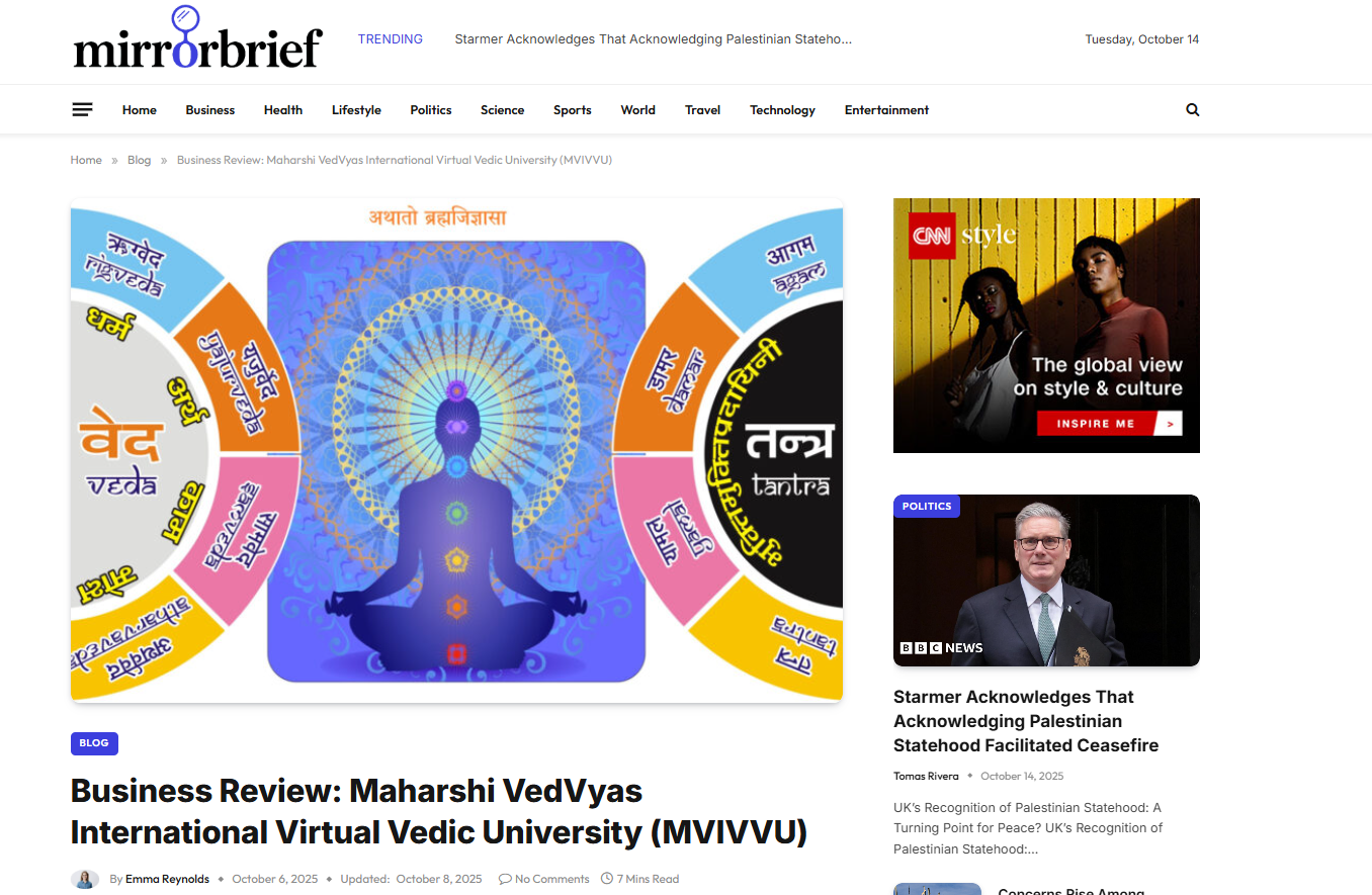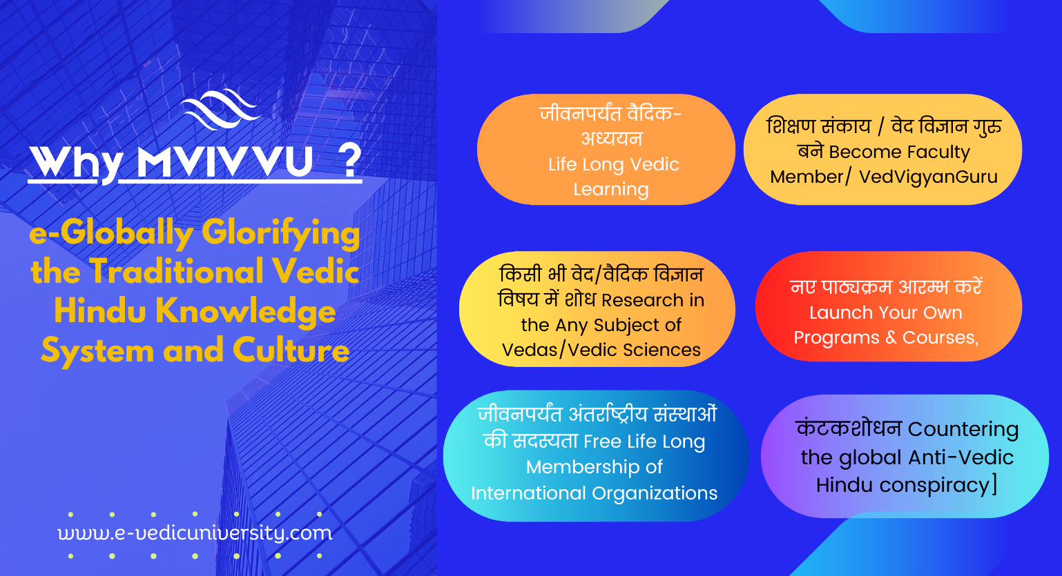 Maharshi VedVyas International Virtual Vedic University (MVIVVU) was established virtually/digitally on 24 March 2010, on the sacred day of Ram Navami, with the special objective of serving seekers who feel a continuous inner call to decipher the ‘secret’ of the longest‑surviving, indelible Sanatan Vedic Hindu dharmic culture. This indigenous Sanatan Vedic Hindu culture rests on the strong and integrated foundation of Vedas, Tantra, Yoga and Ayurveda. MVIVVU has been a pioneer in implementing a fully digital mode of Vedic education at the global level, offering a large number of innovative courses to learners worldwide. The university is accredited by the International Association of Vedic Hindu Universities (IAVHU) with the universal university affiliation code IAVHU1008001UUAC, and is also affiliated with the Association of Vedic Virtual Universities.
